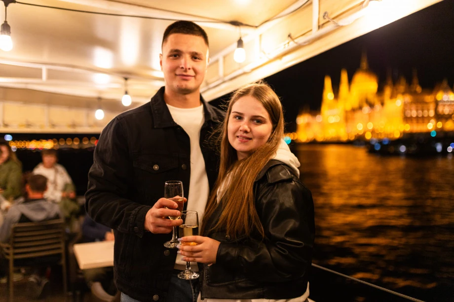 На борту Вас приветствуют бокалом шампанского, которое добавляет особую атмосферу праздника и расслабления. Вы можете насладиться видом на освещенные исторические здания, отражающиеся в спокойных водах Дуная. Живая музыка и приятный вечерний бриз создают идеальную атмосферу для отдыха и наслаждения красотой ночного Будапешта.
